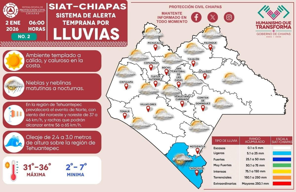 Hoy, 2 de enero de 2026, el Sistema de Alerta Temprana por #Lluvias (#SIAT) de #ProtecciónCivil Chiapas emite el pronóstico de lluvias en nuestro estado. Se esperan lluvias ligeras en la región Soconusco. Así como lluvias aisladas en el resto de la entidad. ¡Toma precauciones y mantente informa...