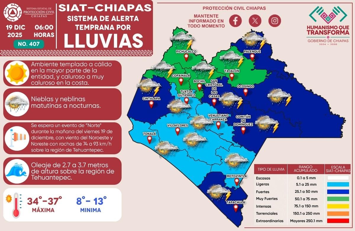 Hoy, 19de diciembre de 2025, el Sistema de Alerta Temprana por #Lluvias (#SIAT) de #ProtecciónCivil Chiapas emite el pronóstico de lluvias en nuestro estado. Alertas por colores: Muy fuertes (51 a 75mm): Norte, Mezcalapa, Bosques y Tulijá. Fuertes (25.1 a 50 mm): Maya, Meseta Comiteca, Selva, V...