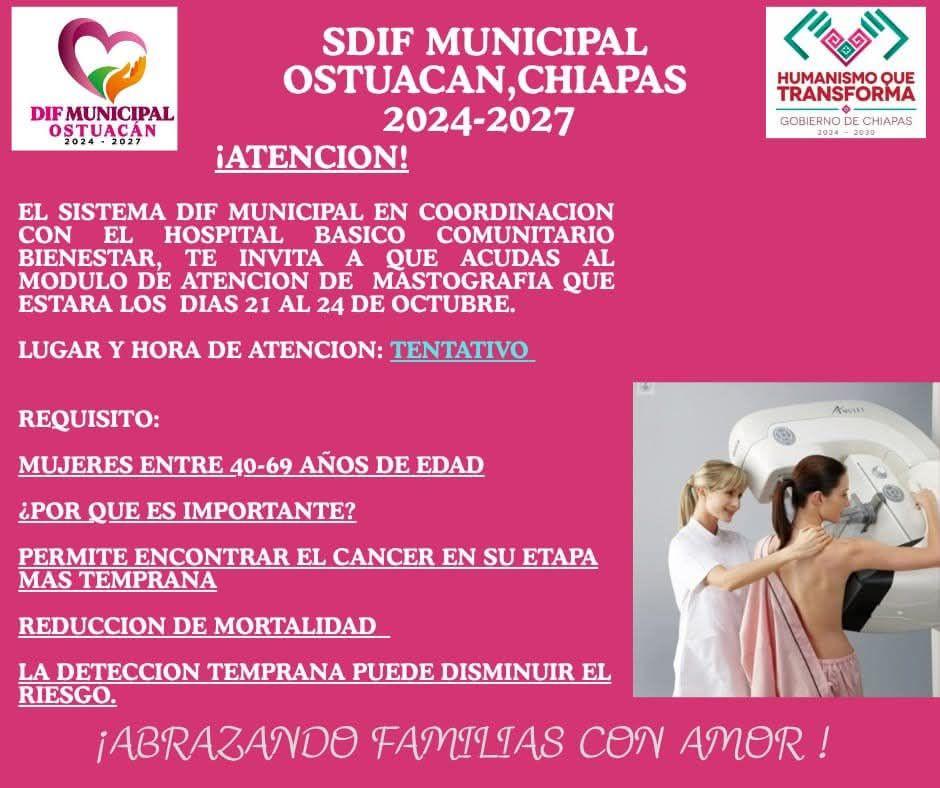 El DIF Municipal Ostuacan, hace una atenta y coordial invitacion al publico en general en coordonación con el H. Ayuntamiento de Ostuacán y e Hospital Básico Comunitario Ostuacan, que acudas al módulo de atención de mastografia....